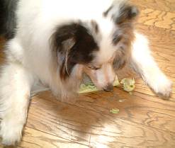 もう十個以上収穫! 毎日、メロン、メロン、メロン攻め・・メロンお化けに襲われそう〜(笑) お味は・・・普通の胡瓜のほうが美味しい・・ ちょっと癖があるお味・・・ 野菜好きのももちゃんにも1本プレゼント^^ 今までに白菜を何度丸かじりされた事か・・・ 買い物袋に鼻を突っ込んで、バリバリと食べます。 ニンジン、大根、キャベツ、トマト果物・・なんでも大好きな野菜犬です^^